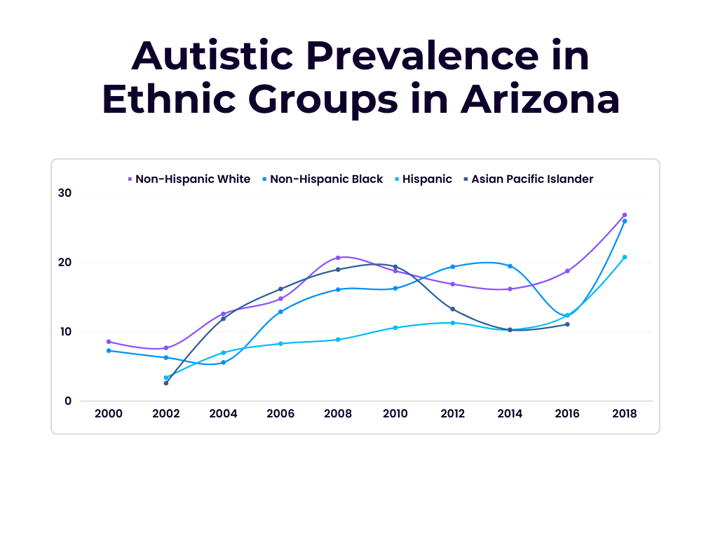 Displayed above is a line graph diving into the prevalence of autism in the state of Arizona and how it varies by ethnicity, with information provided from the CDC and the Arizona Developmental Disabilities Surveillance Program (ADDSP).